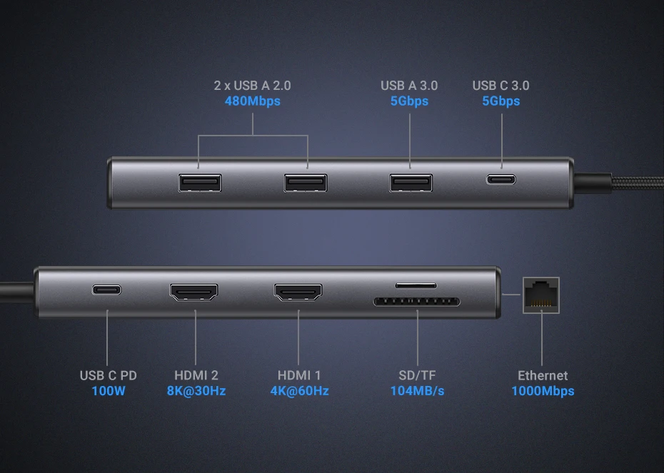 1 × HDMI 8K@30Hz + 1 × HDMI 4K@60Hz + 1 × RJ45 1000 Mbps + 1 × PD 100W + Lecteur SD/TF 104 MB/s + 1 × USB-A 3.0 + 1 × USB-C 3.0 + 2 × USB-A 2.0
