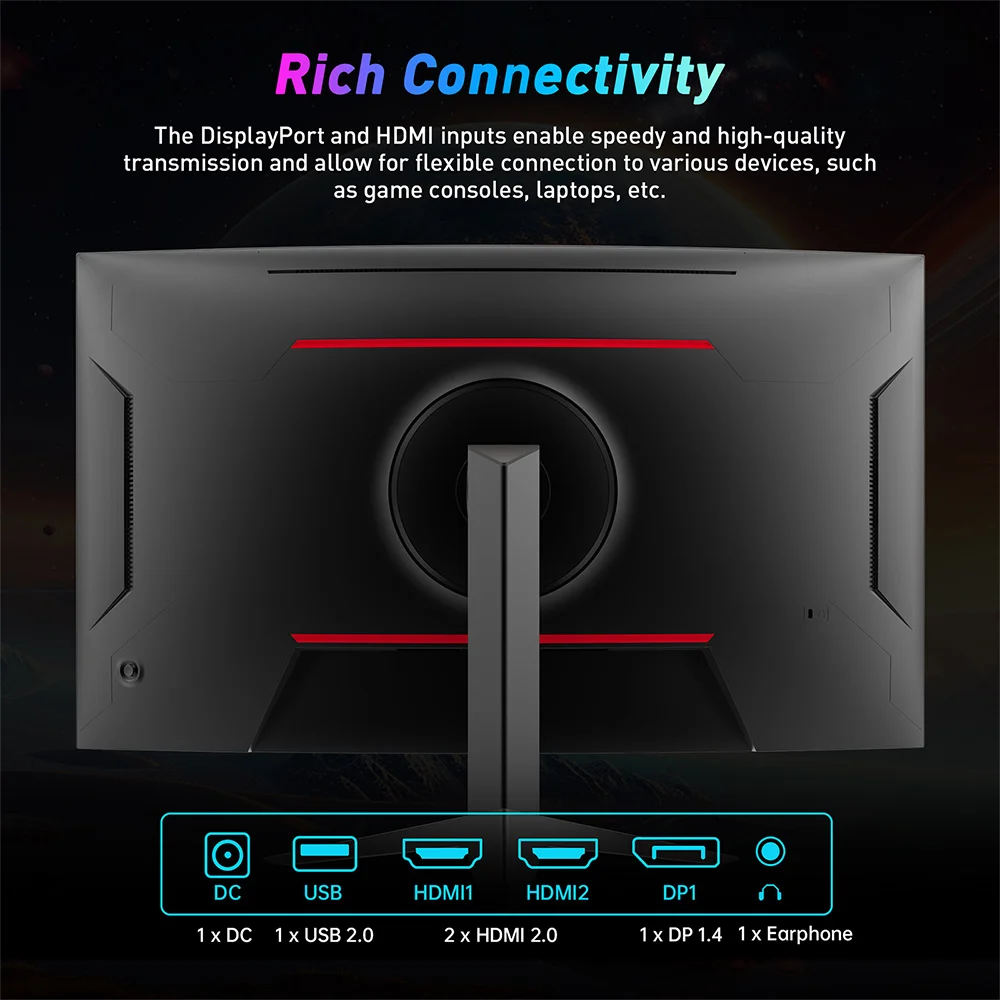 Ce moniteur gaming 240Hz dispose de deux ports HDMI 2.0 et d’un port DP 1.4 qui prennent en charge des résolutions et des taux de rafraîchissement élevés, ainsi qu’une meilleure qualité audio et une bande passante accrue, garantissant des transferts rapides de données et une transmission audiovisuelle de haute qualité. Connectez facilement divers appareils, tels que consoles et ordinateurs portables.